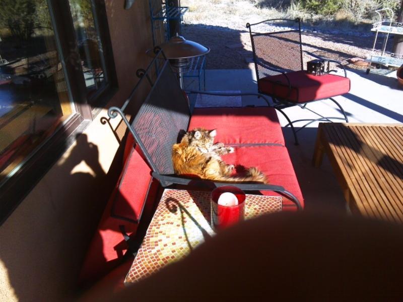 Now this is odd, because we don’t really have domestic cats wandering our rural neighborhood. The houses are quite a distance apart and nobody lets their cats roam far, because the danger from bobcats, coyotes and mountain lions is very real. Especially when the light is dim. He’d never seen this cat before. It looked in and ran off. We haven’t seen it again.