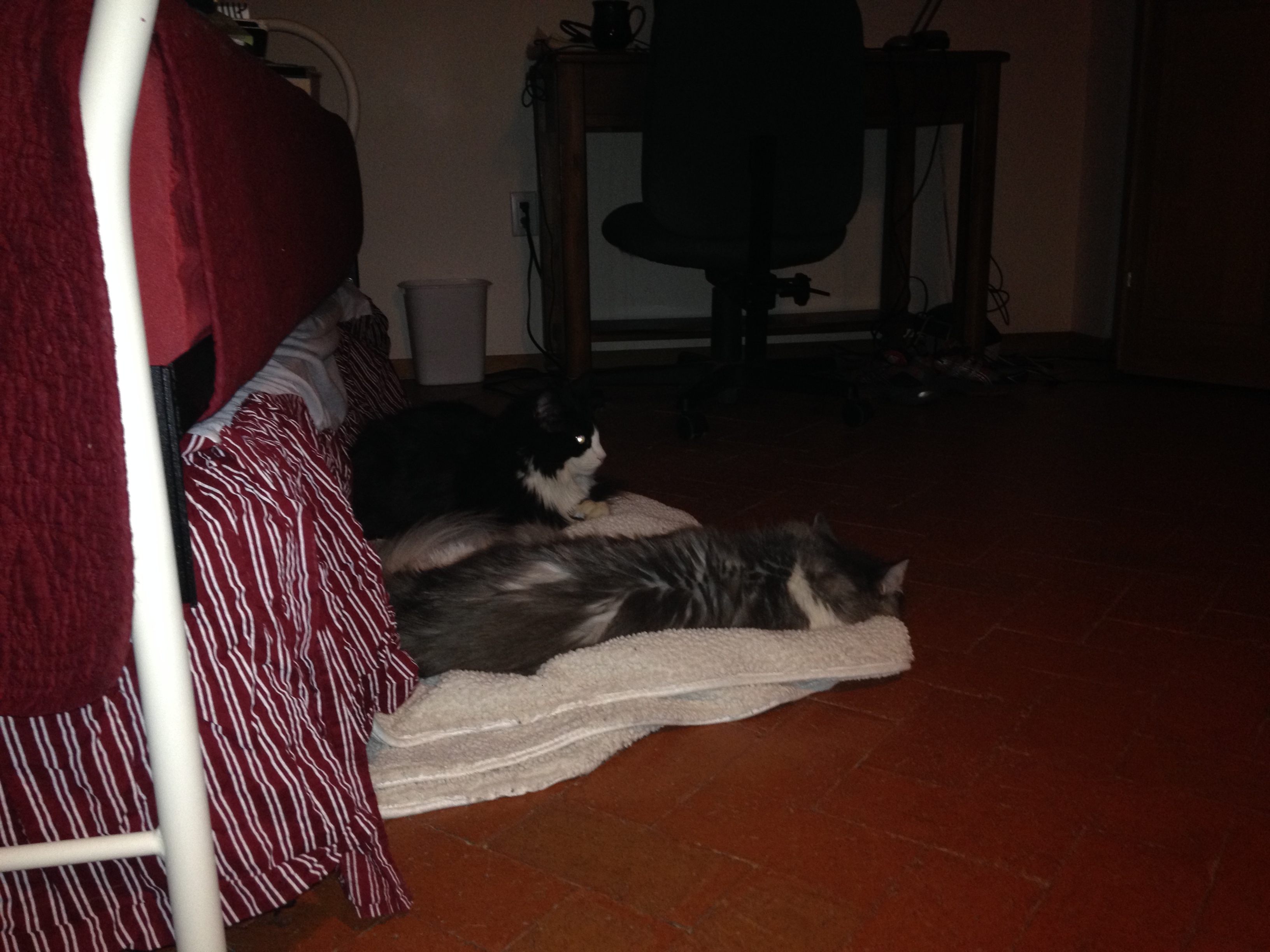 Lately he’s figured out that he can jump up on the towel and bring it down on top of him, making an impromptu blanket fort, from which to stalk me and the Q-tips.
