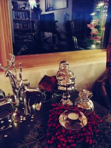 My Nambe reindeer and sleigh set – this gives me all kinds of happy. It’s hard to tell in the photo, but the little jingle-bells string has tiny LED lights, too.