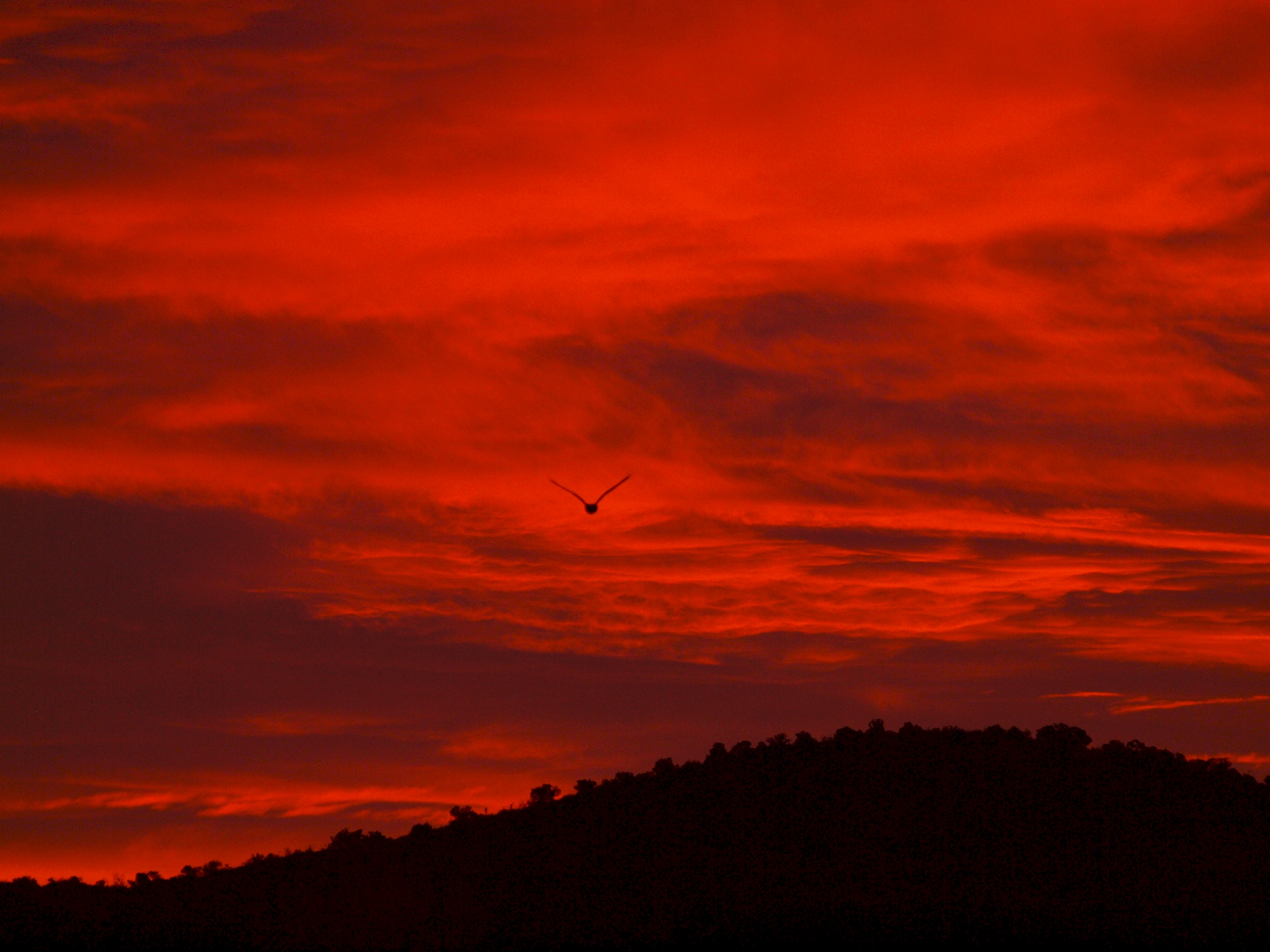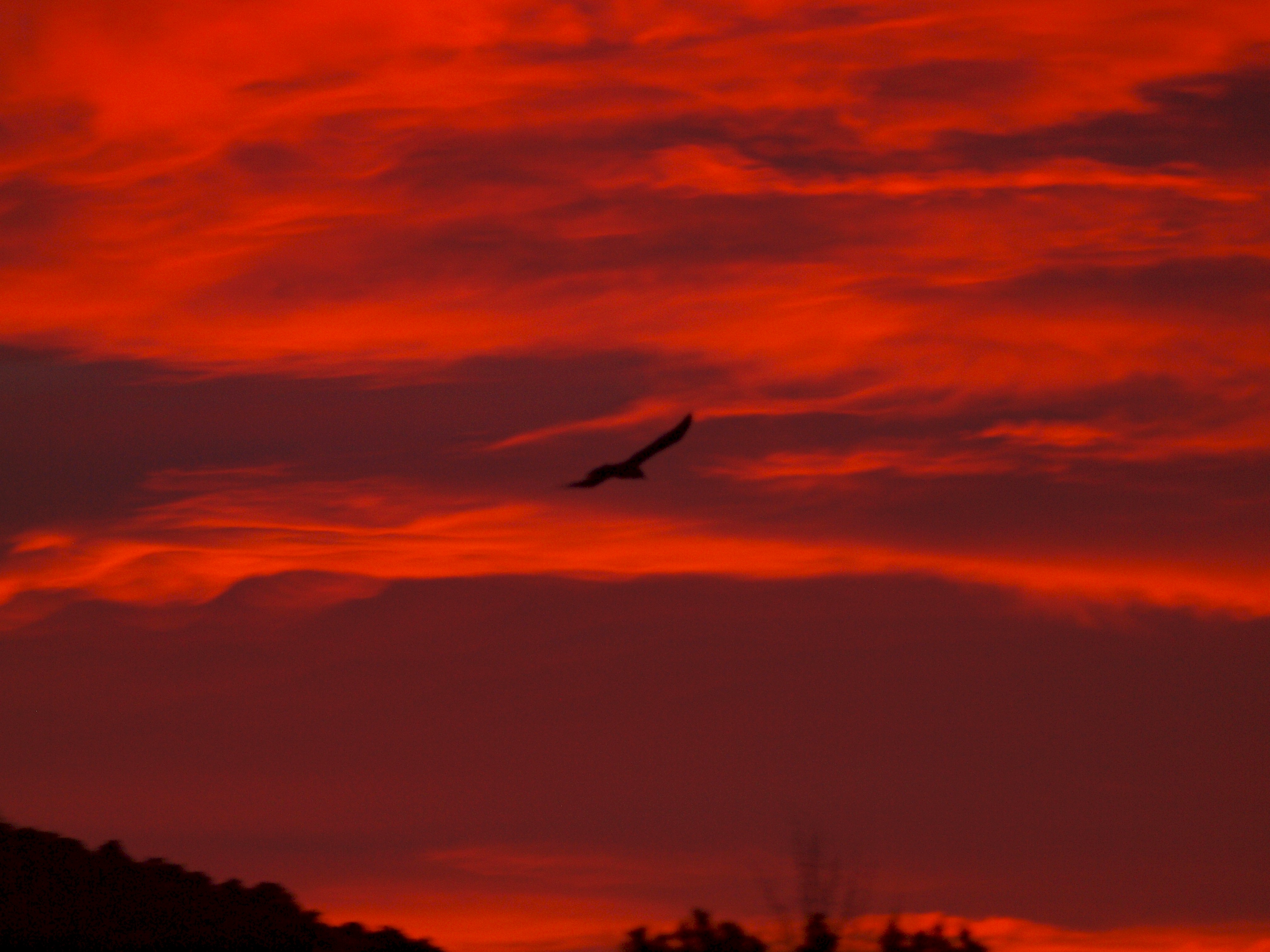 There’s an element of serendipity to so much in life. Like getting a cool photograph – it’s not really something you can plan for. This morning’s sunrise bloomed with exceptionally intense reds, oranges and pinks. But I don’t always go out to snap pics. This morning, though, David needed to charge his MP3 player before we went to the gym, so I had some time to kill. Then I saw a crow sitting in the big cottonwood by our neighbor’s house, thought of Laura Bickle and her crows, and decided to go back in for my telephoto lens. The bird then obliged by winging through the molten sky for me. I got six or seven great pics – most of which you’ll undoubtedly get to see here over the next couple of weeks.