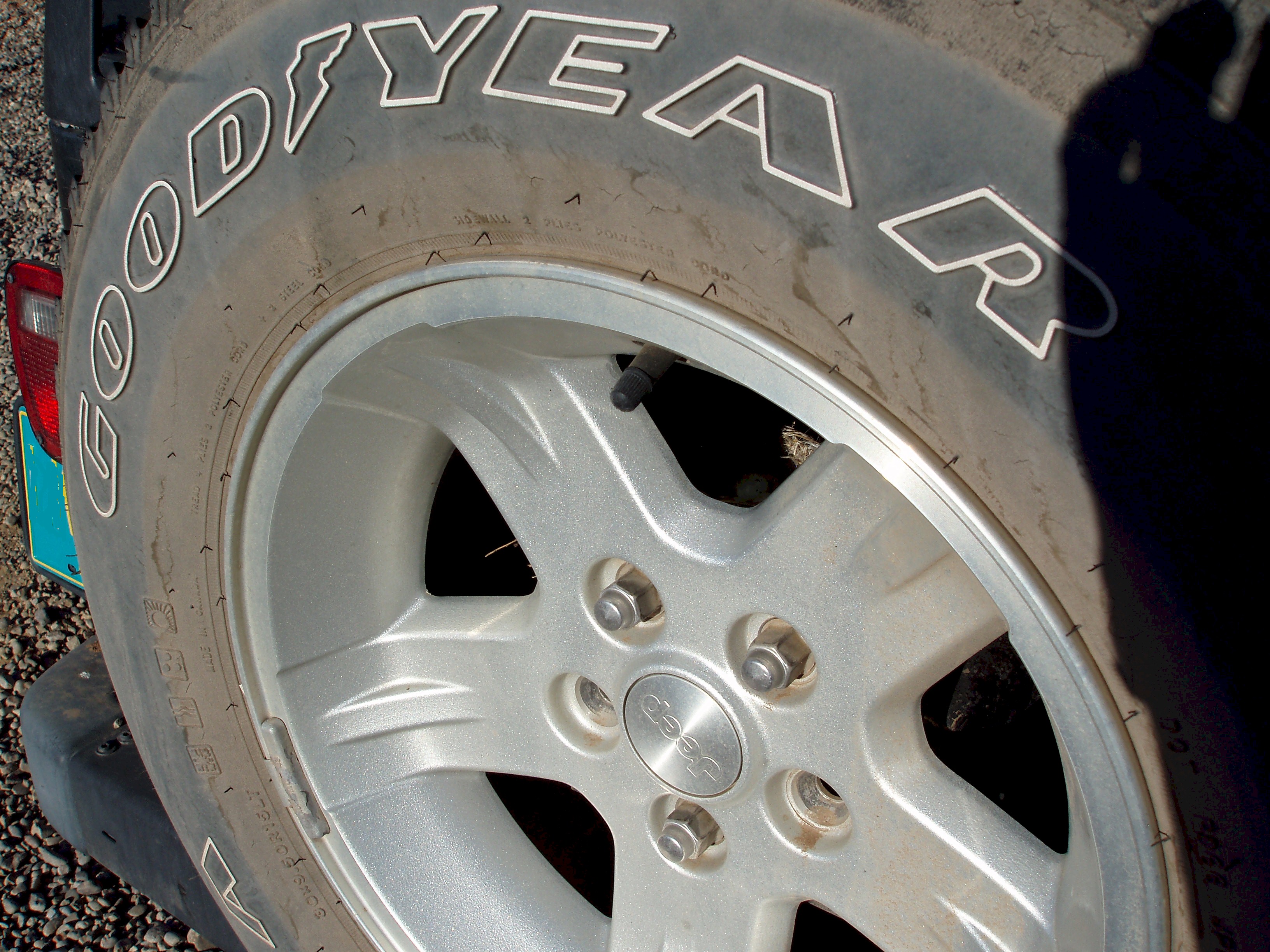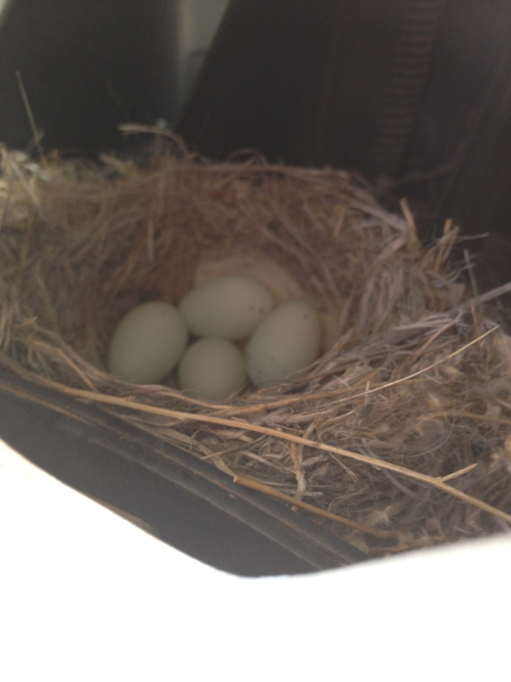 This happened last year, too. Only we didn’t notice the nest until we’d been driving the the Jeep around and it was way too late. This time, David saw momma bird fly out of the tire yesterday afternoon. We figure she must have laid the eggs yesterday morning or the night before. A little research told us that the eggs should take two weeks to hatch and then two more weeks for the birdies to leave the nest.