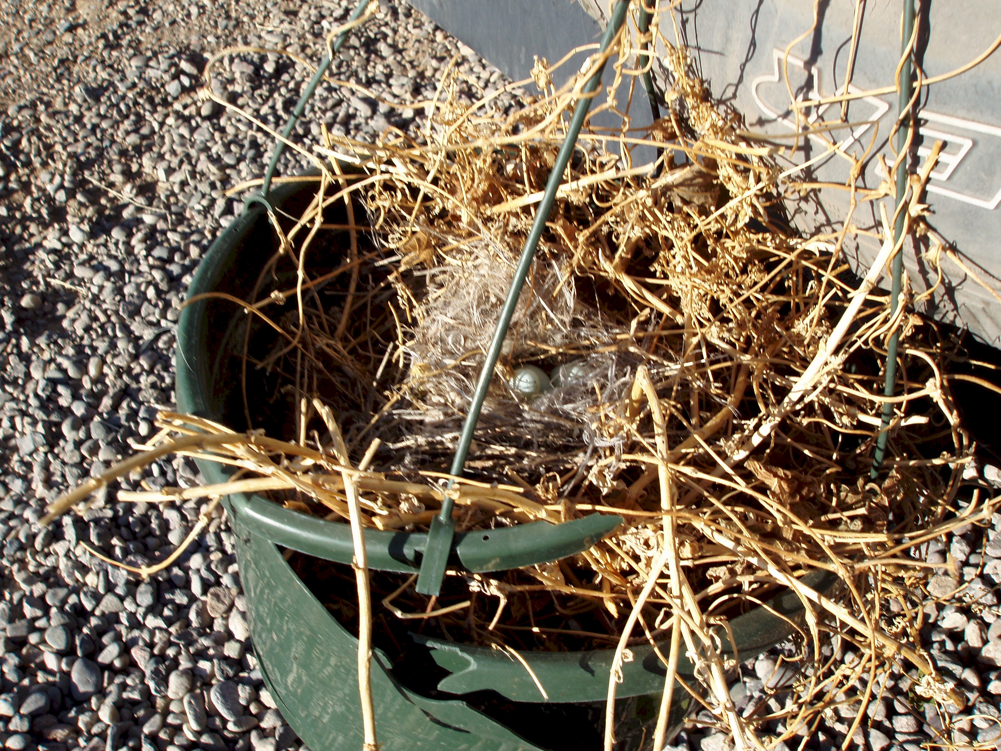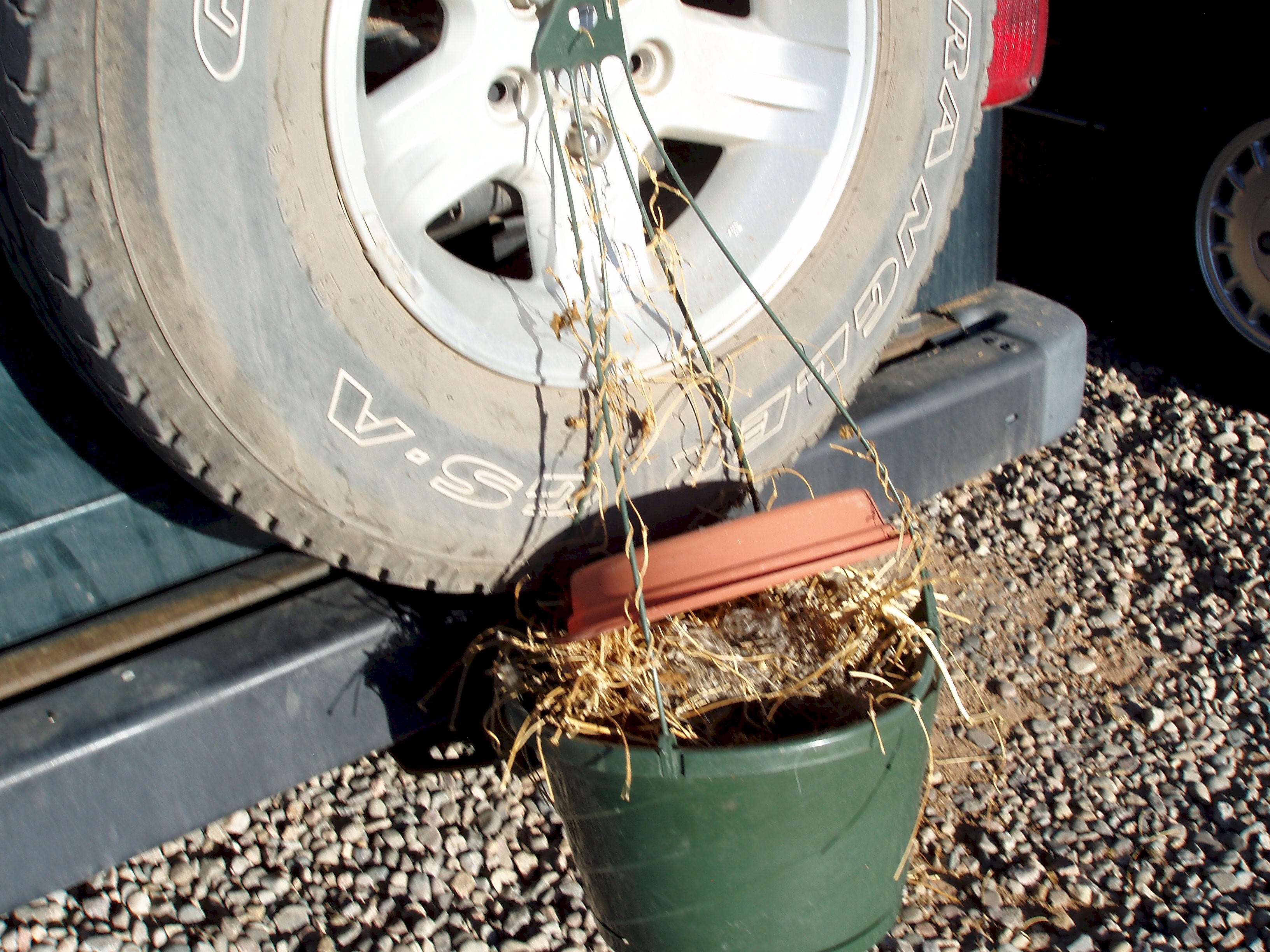 So, I am attempting relocation. The same research said house finches like to build nests in hanging plants, too. I dug out one of my dead hanging plants from last summer and hung it next to the tire. (You can see it in the big Jeep picture – I don’t normally hang dead plant baskets on the Jeep.) Hopefully momma bird got used to seeing it there. This morning, I put on latex gloves and then washed them, to try to remove as much human scent as I could. Then I relocated the nest to the basket.