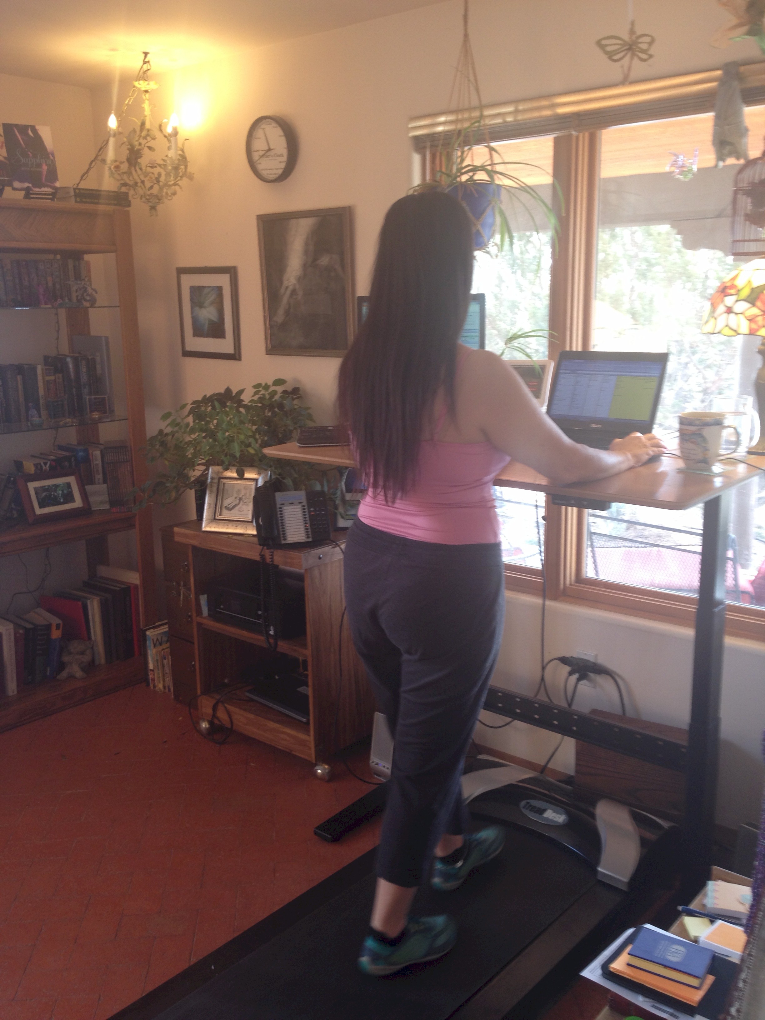 I finally got the desk pieces delivered Tuesday, though I got the treadmill piece quite a while ago. So now I’m all assembled and rocking along. In fact, I’m walking on the treadmill as I write this!