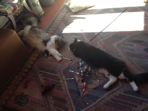 I emerged from my office yesterday to happen upon this scene. Both cats were passed out, nearly nose-to-nose, amidst the detritus of cat toys. As one Facebook commenter pointed out, they look like they partied hard all night.