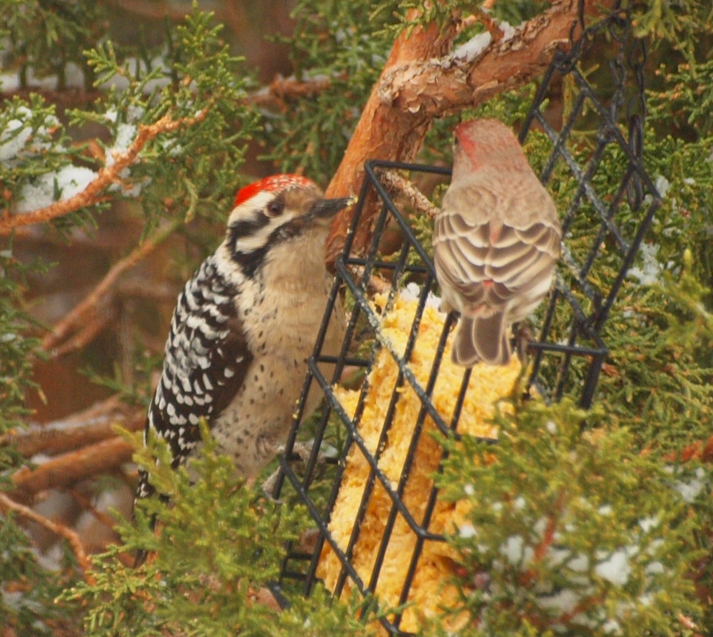 I love how it looks like the ladder-backed woodpecker and the finch are having a conversation over breakfast.