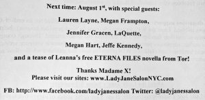 If you’re in the New York City area, I’ll be reading at Lady Jane’s Salon on Monday, August 1. Would love to see you there!