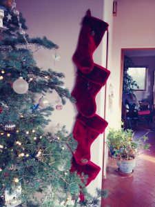 We have an adobe kiva-style fireplace which doesn’t adapt well to stocking-hanging, so I’ve hung them with care on the wall instead.
