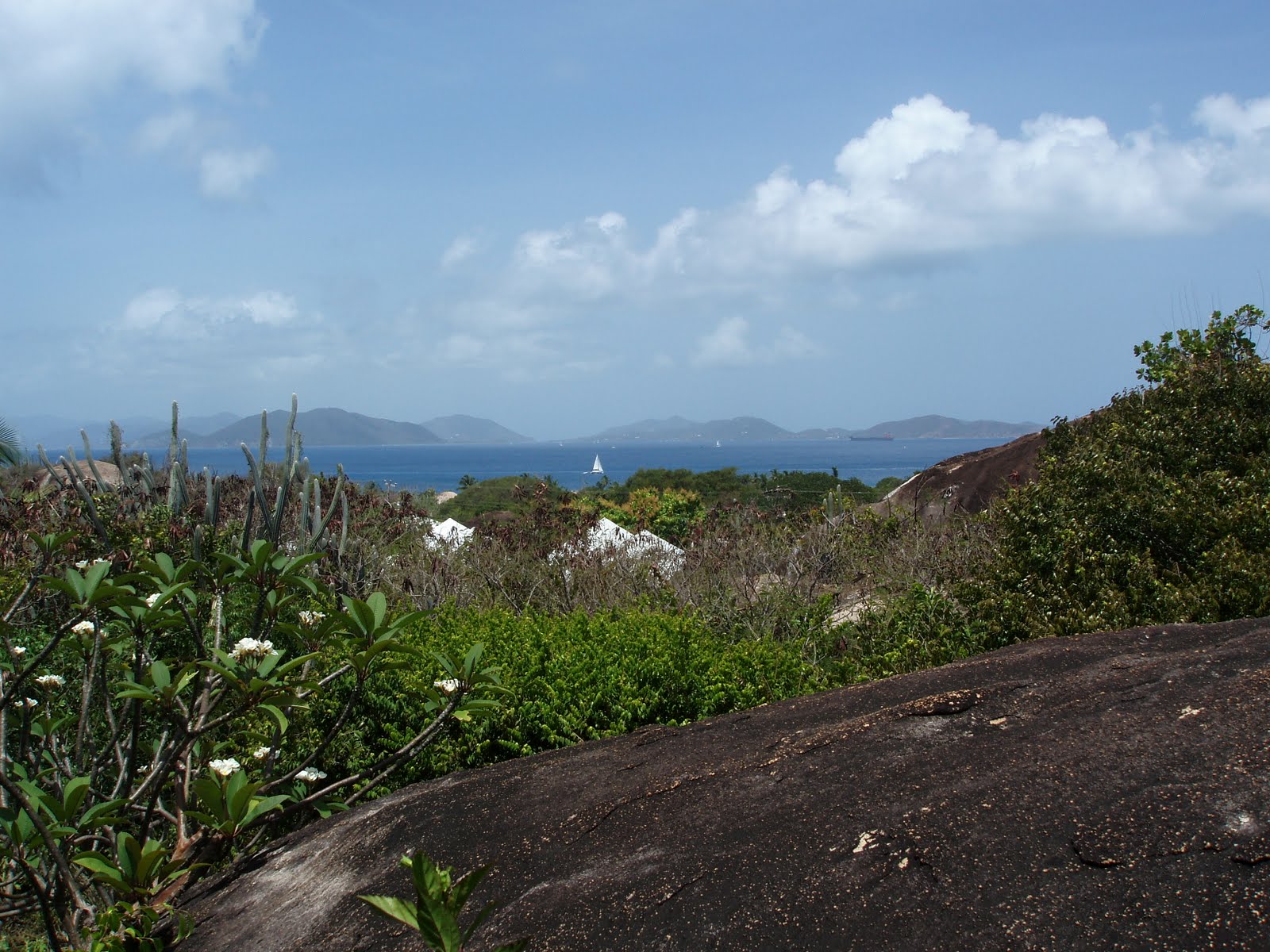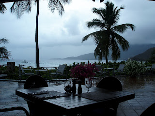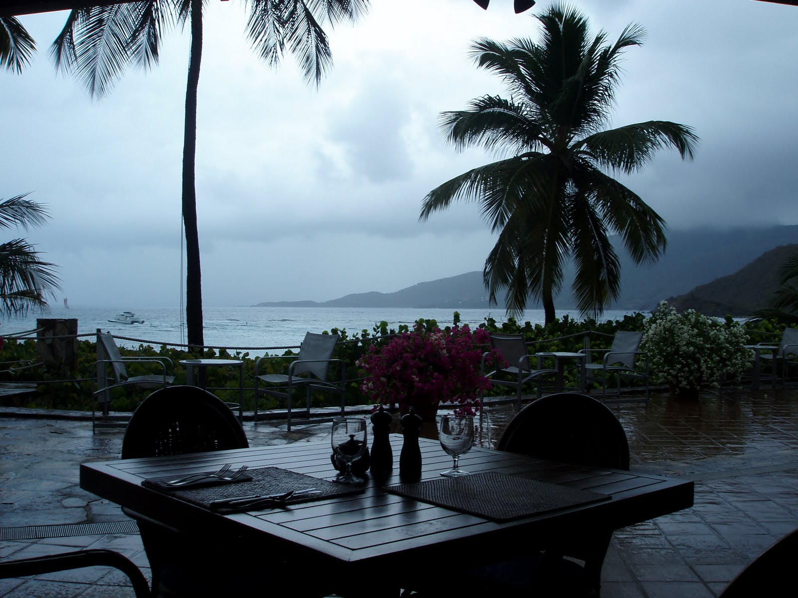 As I mentioned on Sunday’s post, it rained all night Saturday night. Torrential, cooling, tropical rain. It still rained on Sunday morning, so we slept longer, listening to it fall through the broad leaves. And then we decided it was an ideal morning to have breakfast at Little Dix Bay, which is the high end resort on the island. We stuffed ourselves and watched the gentle rain fall. Then we walked on the beach, which is endless. We were the only people on it, because rain is apparently poisonous to tourists.