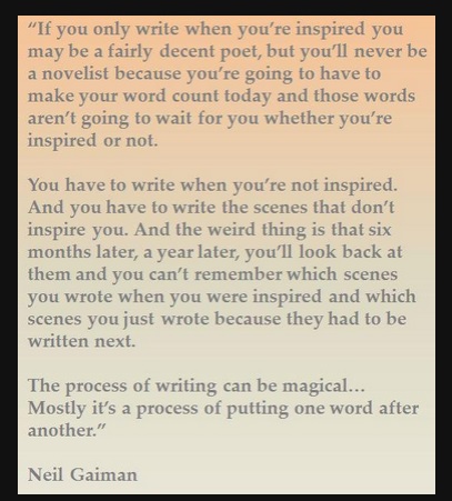 I’m not sure why it doesn’t work this way, but from my own experience, and from what other writers have said, it simply doesn’t. Neil Gaiman has written about this before and I can’t find the direct quote right now (updating to say I ran across it – posted in pic), but particularly for novel writing, there are long slogs where the writer might be bored out of his mind. Neil suggests that a writer who wants to feel constantly engaged by her own work might make a good poet, because poems are short enough. A novelist, however, he points out, has to have more endurance. It takes a long time to write a novel. I’ve calculated that I can write steadily at an average of 1,700 words per day, including days off and intervening edit rounds on other works. This means it takes me approximately 70 days to write a 120K word novel. That’s pretty fast, I’m reliably informed. It also works out to about 3 months writing the story.